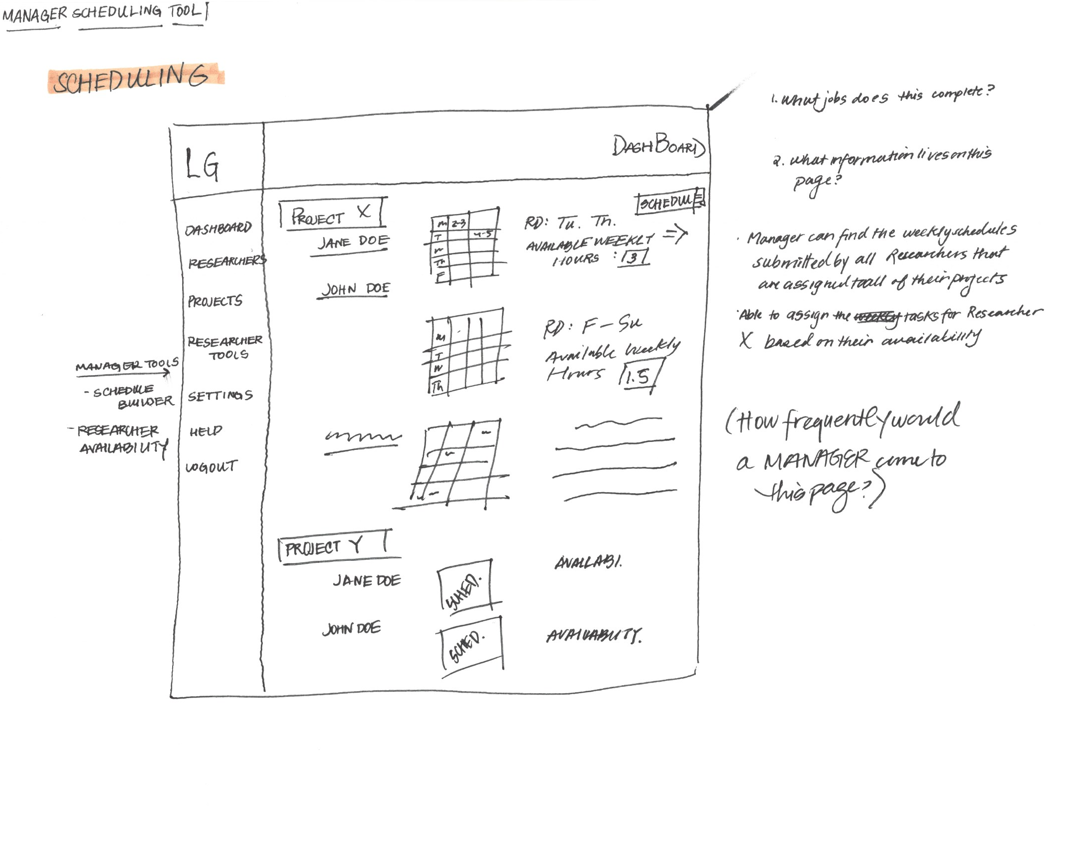 After the interview process, I sketched out the desired workflow for researchers and the CSM team from the user research insights. From the workflow, I was best able to break the designing process of the app into three categories: "Dashboard" redesign, "Scheduling/Tasks" tool, and "Timer" tool. I proceeded to use the Jobs to be Done framework, an alternative of "user personas", to break down each of these categories and map out what needed to be built and why.