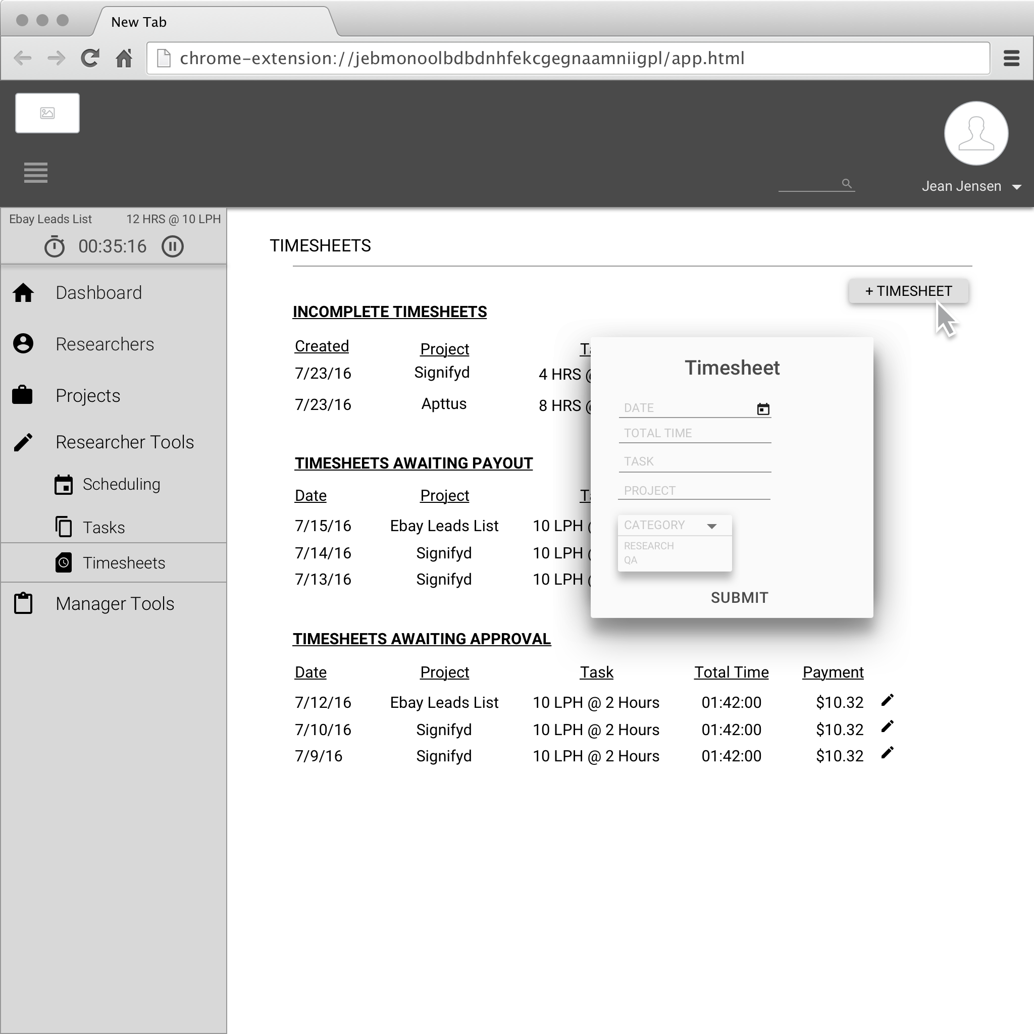 One of the most profound insights of the updated platform and tools was discovering the need for a flat rate, pay-per-lead system instead of the previously used hourly wage. The issue of which wage system to use was something LeadGenius had circled around numerous times previously, however did not have enough validation to justify making the switch. Duringbeta-testing, I received feedback from the researchers in the crowd regarding the difficulty using the new timer to monitor their work and extra administrative tasks that diverted their time away from data mining. I went back to the drawing board with Paul and Amie, the operations development manager, and brainstormed the need to compensate the researchers for their time best utilized. That meant the original inefficient process of compensation needed to be updated to meet the new researcher standard. Upon making this switch, research managers will be able to detect fraudulent timesheets, calculate exact lead-per-hour rates for each researcher, and improve the lead mining process.